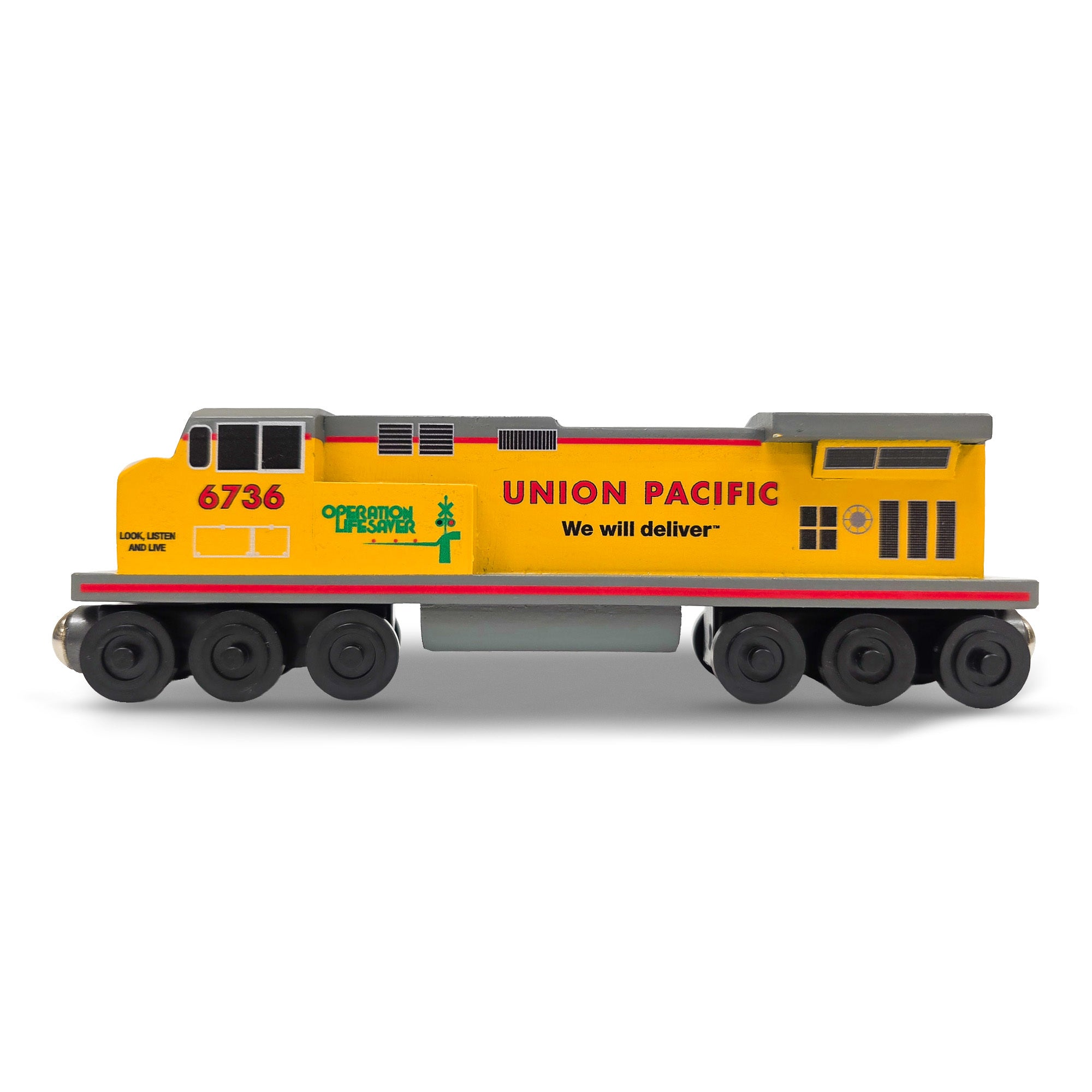 Our UP C44 Operation Lifesaver locomotive honors that legacy with a bold and meaningful design. This model represents the many locomotives painted in special safety liveries and sent across the country to teach schools and communities about railroad safety.